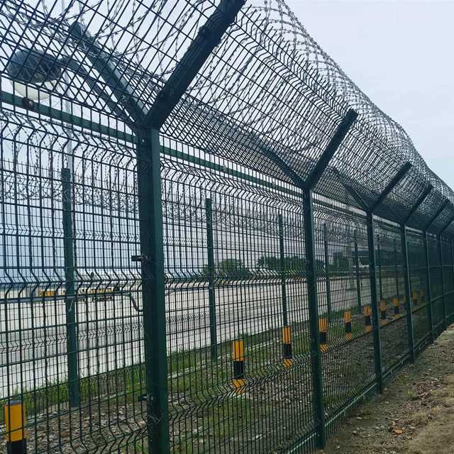 飞机场护栏网又称作“Y型安全防御护网”,是由V型支架立柱,加强型焊接片网,安全防盗连接件和热镀锌刀片刺网组成强度和安全防御性级别很高。近年来,被广泛应用在机场等高安全场所。
